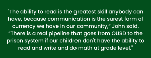 When John looks at the school’s reading proficiency data, he says “it brings tears to my eyes” because he knows how important literacy skills are for children to succeed in life.