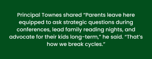 Principal Ron Towns said that having the parents on campus was a small act that is designed to have ripple effects across the school. He said this cohort was intentionally planned for parents who don’t feel confident supporting their child’s literacy.
