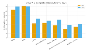 This progress is also evident in district-wide data. Between 2021 and 2024, A–G completion rates increased by 4.7% for African American students and 10.7% for Latino students. School-level data shows even more significant gains. For African American students, A–G completion rates rose at Castlemont (+22.5%), Coliseum College Preparatory Academy (+13.9%), McClymonds (+18.4%), Skyline (+11.3%), and Madison Park Academy 6–12 (+28.3%). During the same period, Latino students also made strong progress, with increases at Fremont (+13.7%), MetWest (+11.9%), Oakland International High School (+23.1%), and Oakland Tech (+10.9%).