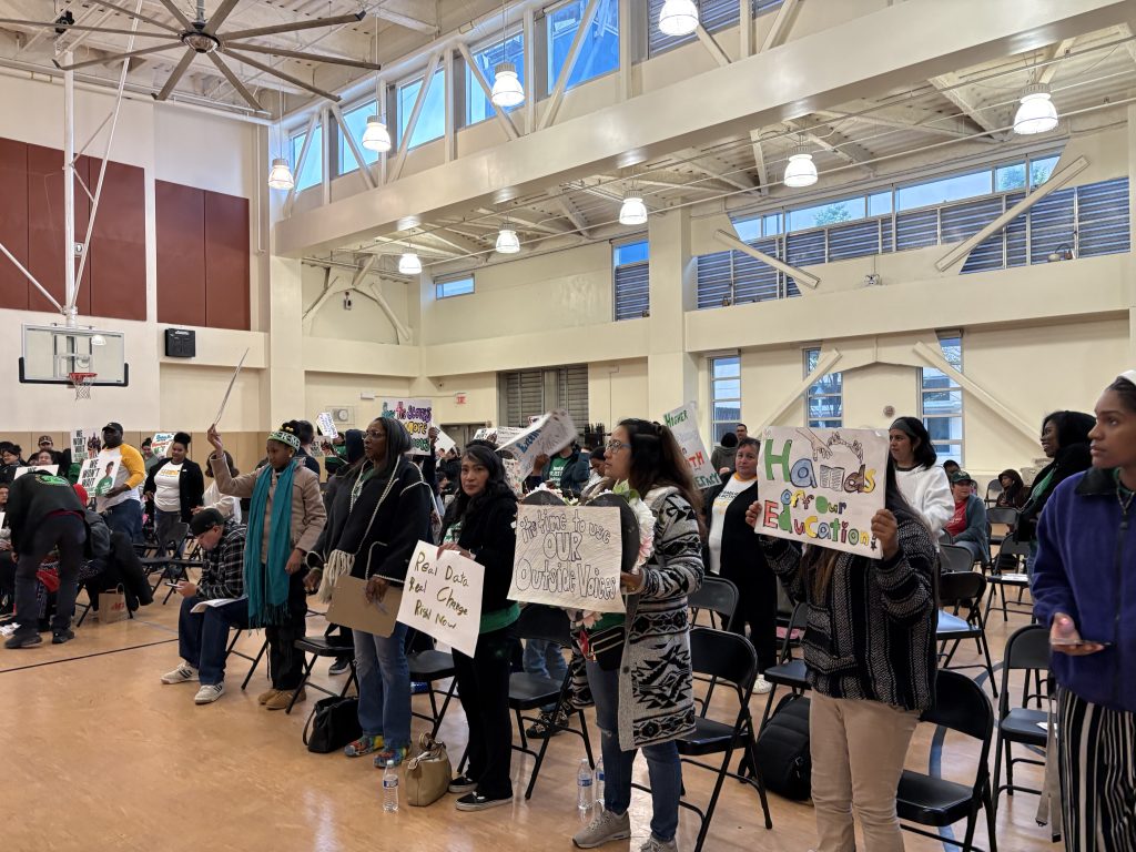 Undeterred, the family and student leaders remained a force at the meeting, continuing to chant and raising signs in English and Spanish with slogans like: “We won’t wait for college eligibility,” “We won’t wait for reading at grade level,” and ”Higher proficiency in math and literacy.”